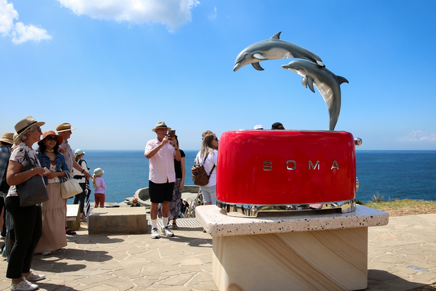 (251024) — SYDNEY, Oct. 24, 2025 (Xinhua) — Visitors view an exhibit at the seaside in Sydney, Australia, Oct. 24, 2025. Featuring sculptures by artists from Australia and across the world, the outdoor exhibition dubbed “Sculpture by the Sea” is held along the Bondi to Tamarama coastal walk in Sydney and will run until Nov. 3 this year. (Xinhua/Ma Ping)