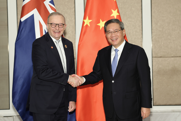 (251027) — KUALA LUMPUR, Oct. 27, 2025 (Xinhua) — Chinese Premier Li Qiang holds talks with Australian Prime Minister Anthony Albanese in Kuala Lumpur, Malaysia, Oct. 27, 2025. (Xinhua/Huang Jingwen)